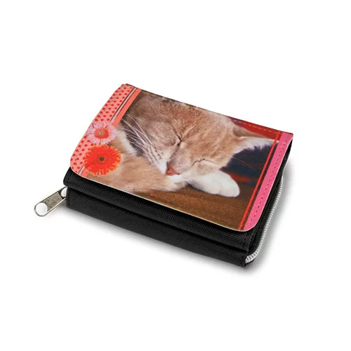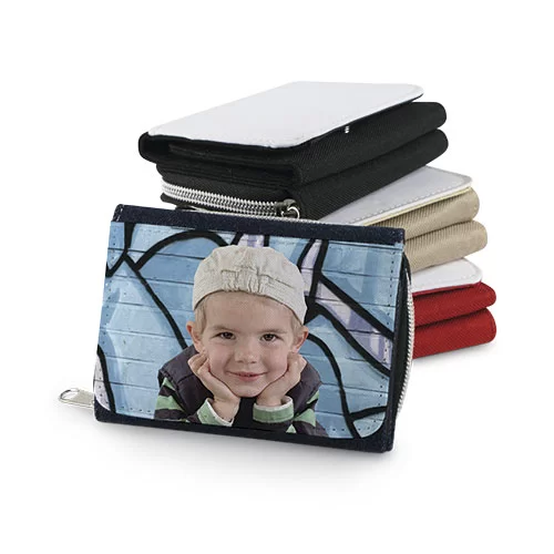 Portefeuille textile avec 4 compartiments à cartes et 1 pour billets, avec porte-monnaie, Fermeture magnétique et fermeture éclair tout autour.